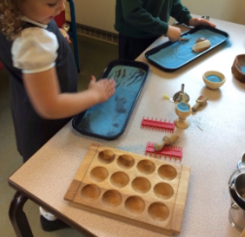 The play in my sand area from my Reception children was low level play; tipping, pouring and making sand castles. Running race cars round the edge of the tray.